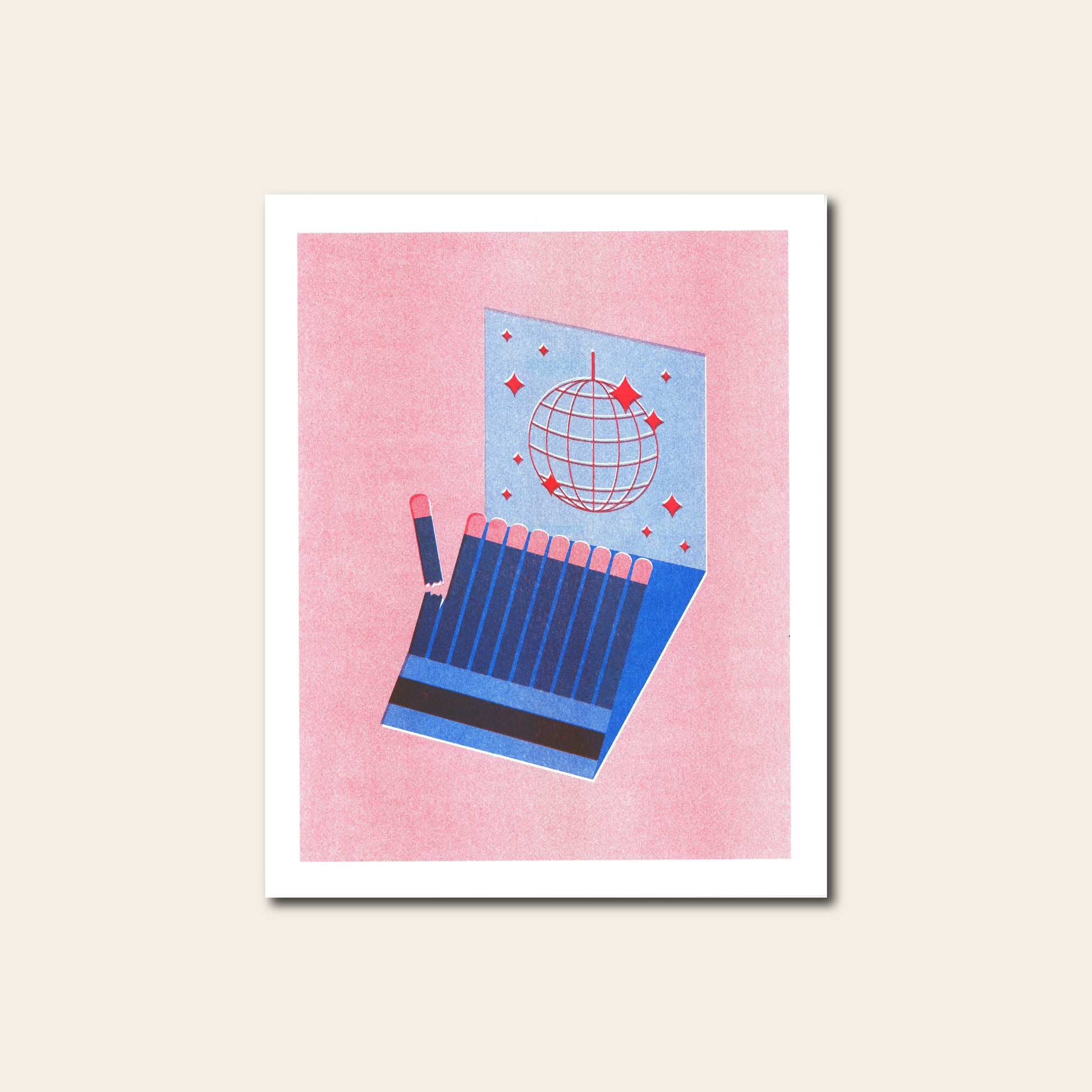 Illustrated and printed using the Risograph technique, this piece features vibrant, layered colors with unique textures and slight variations—making each print one of a kind. The subtle imperfections add to its charm, ensuring your matchbook print is as distinct as it is eye-catching. Printed on high-quality, sustainable paper, this artwork is a bold and playful addition to any space.