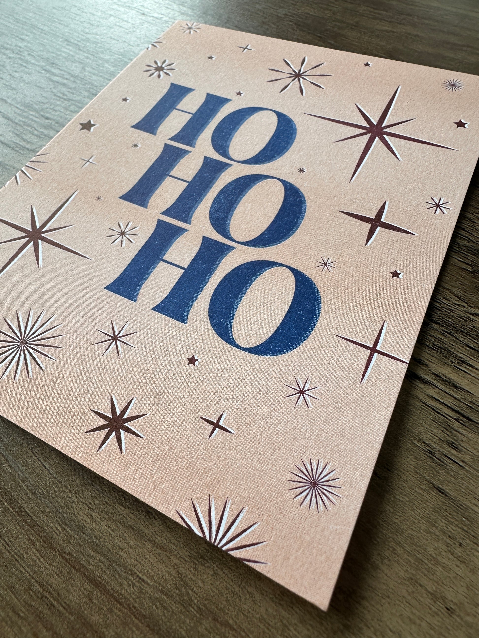 A bold, vintage-inspired holiday card with classic mid-century flair. Ho Ho Ho pairs crisp retro typography with vibrant Riso colour for a nostalgic, cheerful design. Perfect to send or display as a fun, MCM-style mini art print.