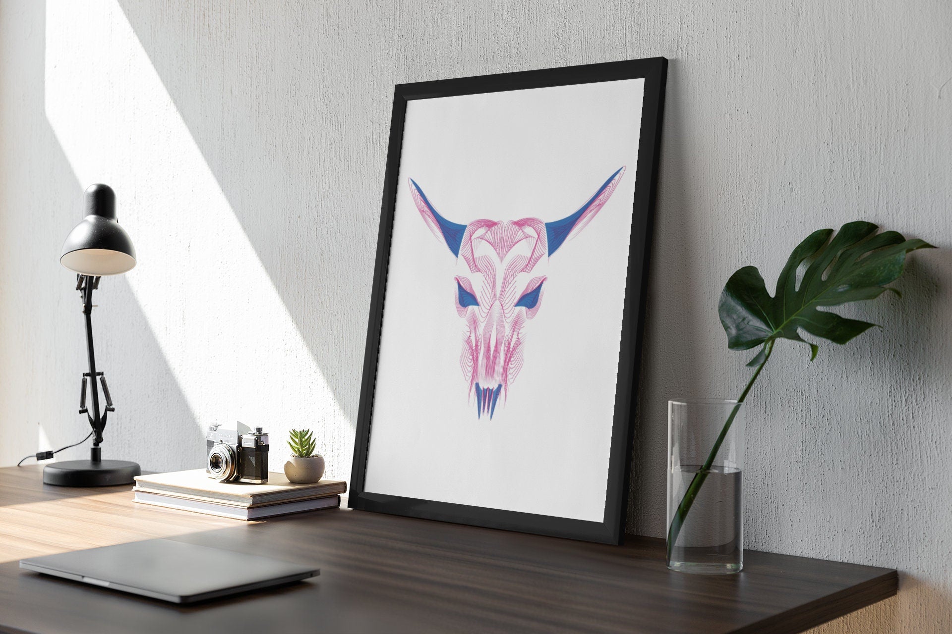 Add bold character to your space with this trio of animal skull prints, featuring a tiger, bull, and mouse skull. Printed in vibrant fluorescent pink and blue, each piece is unique due to the hand-fed Risograph technique, which creates slight variations and adds charm to the design.